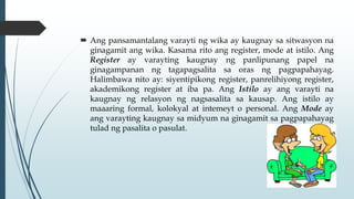 Ang rehistro ay barayti na may kaugnay na panlipunang papel na ginagampanan ng tagapagsalita sa oras ng pagpapahayag. Paglalahat ng aralin Pagsasanay blg. Start studying KPWKP - Mga Barayti ng Wika.