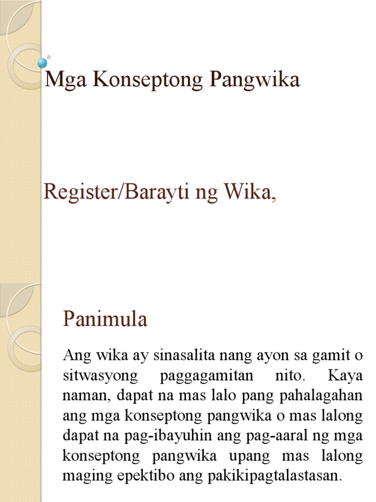 REHISTRO AT BARAYTI NG WIKA Ang BARAYTI ay itinuturing na higit na mas masaklaw na konsepto kaysa sa tinatawag na istilo ng wika. Mga Tungkulin Barayti At Rehistro Ng Wika.