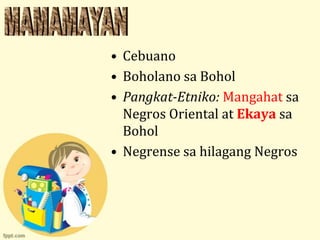 ANG 7 PANGUNAHING PANGKAT ETNIKO SA PILIPINAS 1ILOKANO 2PANGASINENSE 3KAPAMPANGAN 4TAGALOG 5BIKOLANO 6BISAYA 7MOROMUSLIM 3. Cebuano Boholano sa Bohol Pangkat-Etniko.
